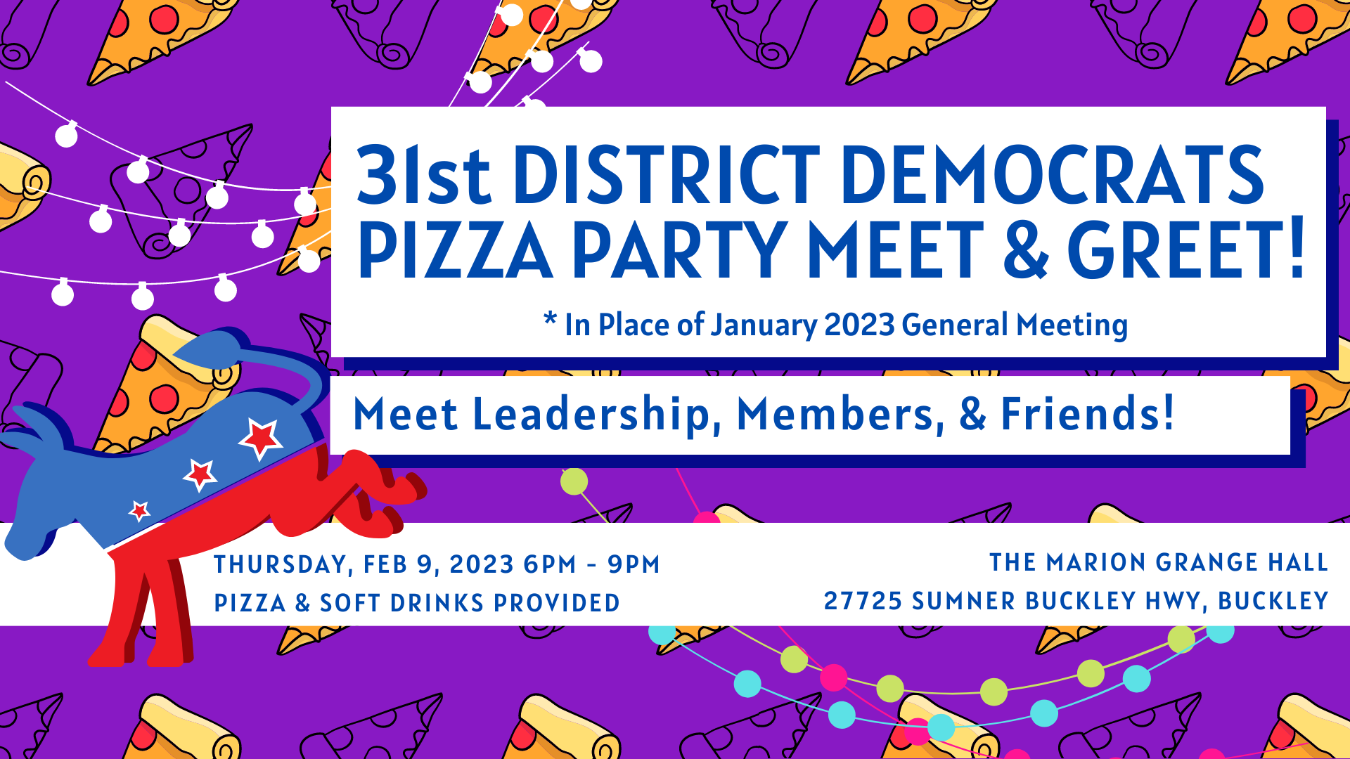 | Instead of a January general meeting, the 31st District Dems are throwing a pizza party and you're invited! Come meet the new Board, PCOs, and community members – it's time to socialize, and we'll kick off this new year with some fun! We will be providing the pizza and soft drinks. Bring a side/dessert to share if you're so inclined, and otherwise all we need is YOU. Thursday, February 9, at the Marion Grange Hall in Buckley, 6pm-9pm. 27725 Sumner Buckley Hwy, Buckley, WA |