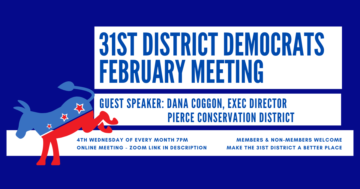 | You are invited to participate in our next monthly meeting, which will be held Wednesday, February 22, at 7:00 pm. Our special guest speaker will be Dana Coggon, Executive Director of the Pierce Conservation District! Dana will be joining us to kick off our Year of the Environment! As the director of PCD she will joyfully share with us all about the good work they do, and how we as a legislatively minded organization can advocate for them to be able to do more of it. Please check out PCD’s website at https://piercecd.org/ and come with questions! The meeting link button below will allow you to pre-register in advance or join the meeting once it is in progress. A link to the meeting's agenda is provided below and will be updated prior to the meeting. |