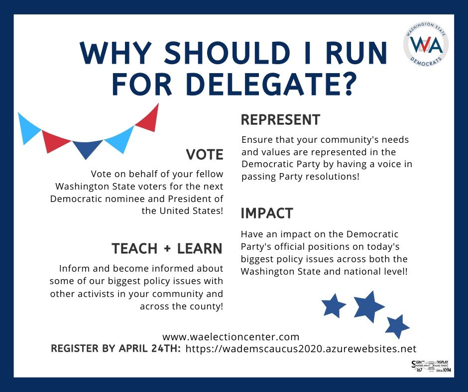 We have 22 delegate positions and 12 alternates to fill in the 31st LD, and we need a wide diversity of folks to stand up and be counted in support of their preferred candidate. Joe Biden and Bernie Sanders were the only candidates to garner more than 15% of the popular vote during the March primary, so we need delegates for both candidates to participate in the process of choosing national delegates to represent Washington State at the Democratic National Convention (in Milwaukee) this August and to vote on the WA State platform at the State Convention (in Tacoma) in June.