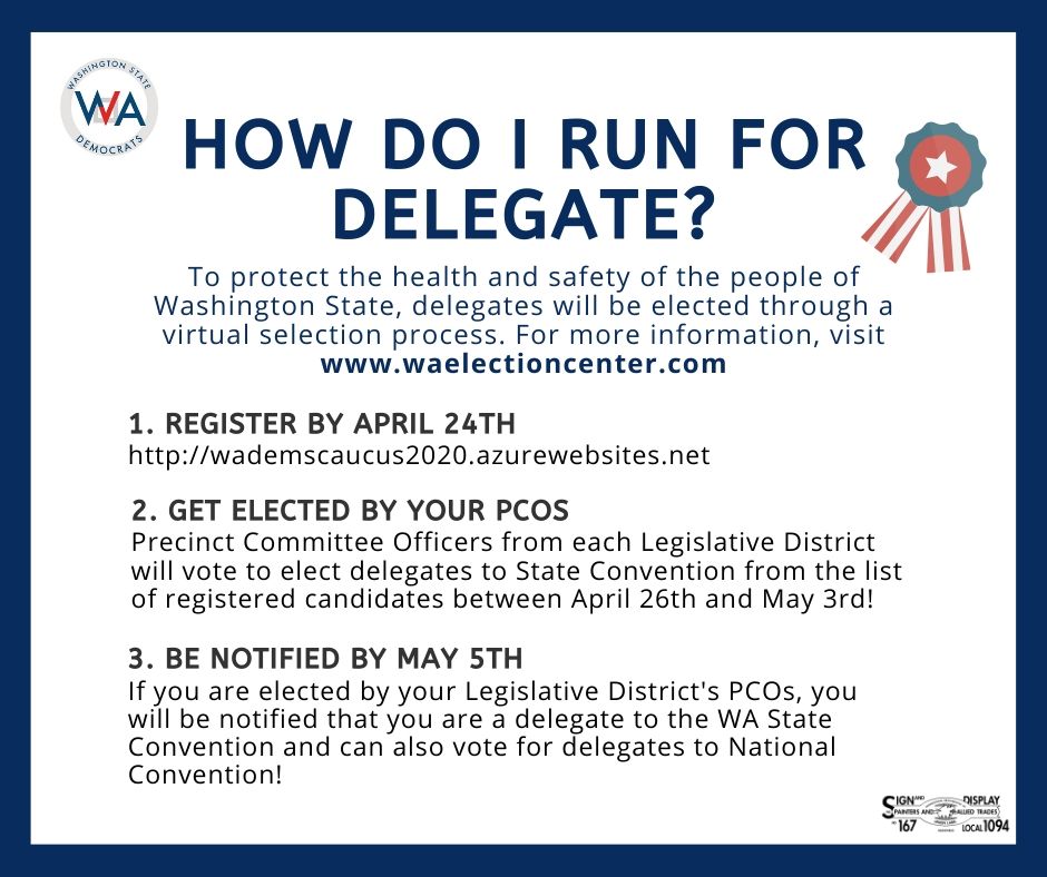 In accordance with Governor Inslee's Stay Home Stay Safe Order, we will be having our meetings virutally till further notice. We understand that there are some drawbacks to switching to this new medium, but this is currently our best idea on how to stay engaged during this busy election year.